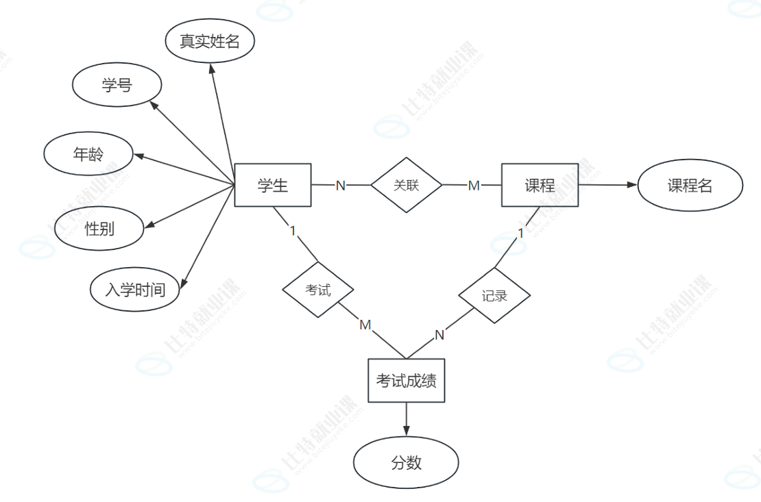 对于多对多关系,可以使⽤中间表进⾏记录,⽐如⼀个学⽣参加了某⼀⻔课程的考试得到了相应的 成绩,⽤E-R图表⽰如下