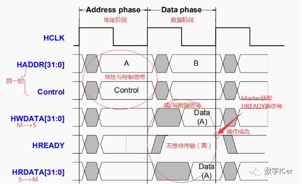 2)一次AHB传输的地址阶段可以与另一次AHB传输的数据阶段重叠,从而实现流水线操作。然而,如果一次传输的数据阶段被延长,则紧随其后的传输的地址阶段也会被延长。然而,如果一次传输的数据阶段被延长,则紧随其后的传输的地址阶段也会被延长。