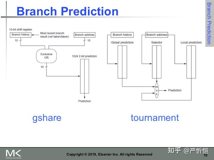 目前我们讨论的预测器仅基于局部分支历史(即该分支自身先前的行为)。实际上,条件分支的行为还受程序执行路径的影响,这意味着最近的若干条件分支的全局历史也会影响预测准确度。常见的解决方法是采用(m n)关联预测器,其中m表示最近的m个分支的全局历史,n表示n位局部预测器。2位全局分支历史记录追踪最近2个分支的行为,用于索引具体选择哪一组2位预测器;每组2位预测器通过分支地址的最后4位进行索引(即每组包含16个2位预测器),最终预测结果由全局分支历史和分支地址共同决定。
