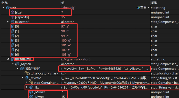 **_Bx下表示的是buf数组,_Mysize下表示的是_size,Myres下表示的是_capacity。**这里看到buf数组中存放者"abcdef"字符串。