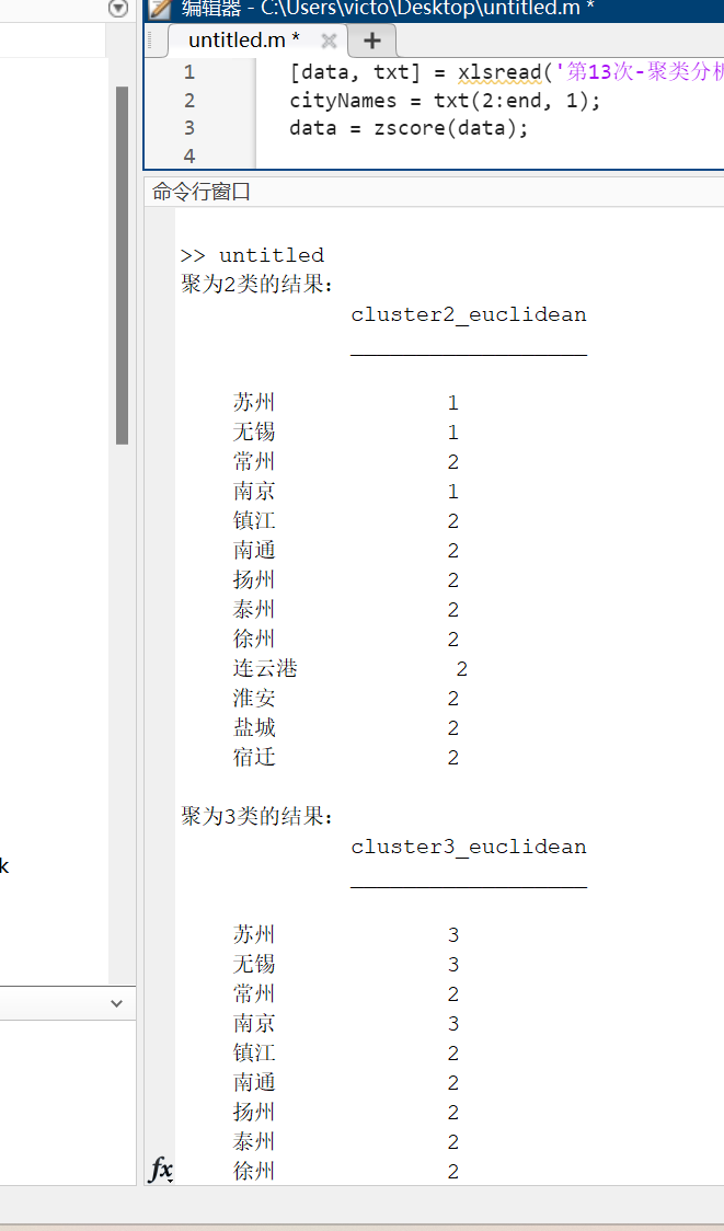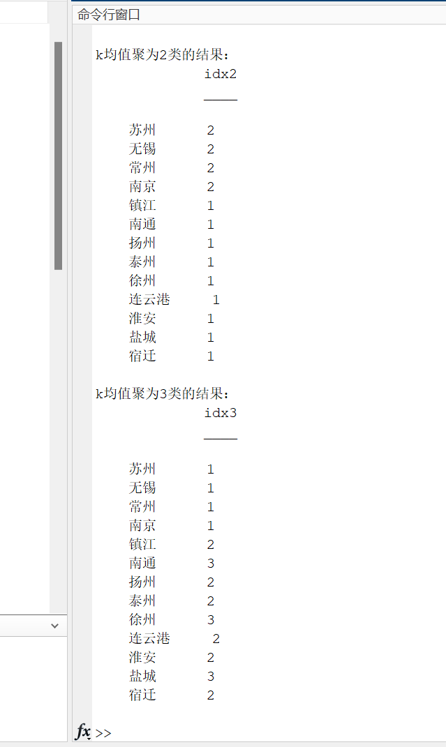 实验第一部分围绕江苏省 13 个地市国民经济数据展开聚类分析,让我熟练掌握了层次聚类的完整流程。从使用xlsread函数读取 Excel 数据、提取城市名称标签,到利用zscore函数完成数据标准化处理,我认识到数据预处理是保证分析结果准确的关键 ------ 不同经济指标量纲差异极大,不进行标准化会直接导致聚类结果失真。实验中采用欧氏距离衡量样本相似度、内平方距离法(Ward 法)进行聚类,并绘制上下两种方向的谱系图,直观呈现了城市间的经济相似性与层级关系。通过对比聚为 2 类和 3 类的结果,我清晰看到江苏省各地市经济发展的分层规律,发达城市、中等发展城市与发展相对滞后城市的划分符合实际情况,深刻理解了层次聚类在区域经济分析、分类评估中的实用价值。选做题中的 K-Means 聚类,让我对比了层次聚类与划分式聚类的差异,前者适合小样本、可展示层级结构,后者运算高效、适合大数据量,两种方法的互补性让我对聚类算法的选择有了更清晰的判断。