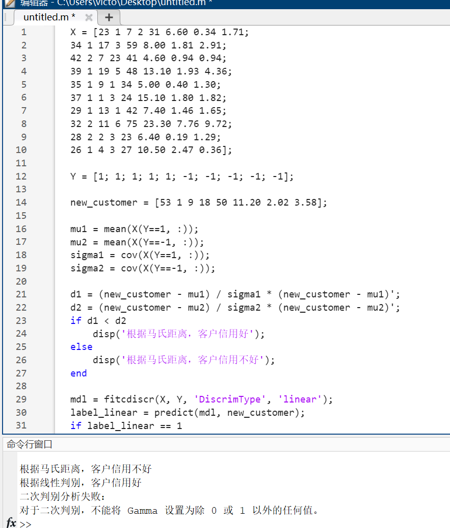 实验第二部分的银行客户信用判别分析,是我首次系统学习判别分析这一有监督统计方法。基于客户年龄、收入、债务等多项指标,我分别运用马氏距离判别法、线性判别法和二次判别法完成信用好坏的分类预测。实验过程中,我掌握了各类判别方法的核心原理:马氏距离消除了量纲和指标相关性的影响,线性判别假设各类协方差矩阵相同,运算简洁,二次判别则适用于协方差矩阵不同的场景。通过对新客户信用的判别,我切实体会到判别分析在金融风控、信贷审批中的重要作用,它能依托历史数据建立判别规则,为实际决策提供科学依据,有效降低信贷风险。同时,我也学会了根据数据特征选择合适的判别方法,提升了解决实际分类问题的能力。