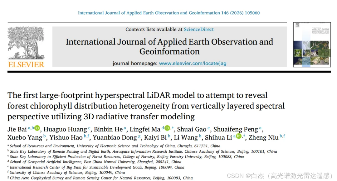 近日,电子科技大学定量遥感团队白杰副研究员(师资博士后)在遥感领域国际顶级期刊International Journal of Applied Earth Observation and Geoinformation发表研究。该研究通过首个大光斑全波形高光谱激光雷达(Full-waveform large-footprint hyperspectral LiDAR , LFHSL)辐射传输模型 ,首次从垂直分层光谱视角揭示森林叶绿素分布异质性,创新性提出 "光谱指数时间廓线(Spectral Index Time Profile, SITP)" 概念,探索大光斑高光谱激光雷达在复杂森林区域分层植被健康状况诊断潜力,让乔木、灌木、草本层的叶绿素含量精准 "显形"。这项研究从理论视角破解了复杂森林垂直生化监测的技术瓶颈,更为大光斑多光谱/高光谱星载激光雷达传感器研发提供了关键指引,助力森林健康管理与异常扰动早期预警!