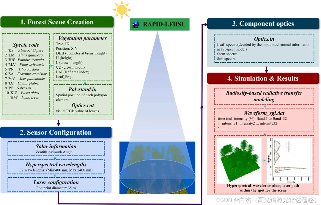 LFHSL 模型构建:基于 RAPID 辐射传输模型框架,研发大光斑全波形高光谱 LiDAR 模拟模块,涵盖 32 个离散波长(400-2400nm),本文依据中国科学院空天信息创新研究院高光谱激光雷达设备的有效范围,设置 410-1030nm,光谱分辨率 20nm,激光光斑直径设为 35m,可模拟复杂森林场景的大光斑全波形高光谱回波波形。