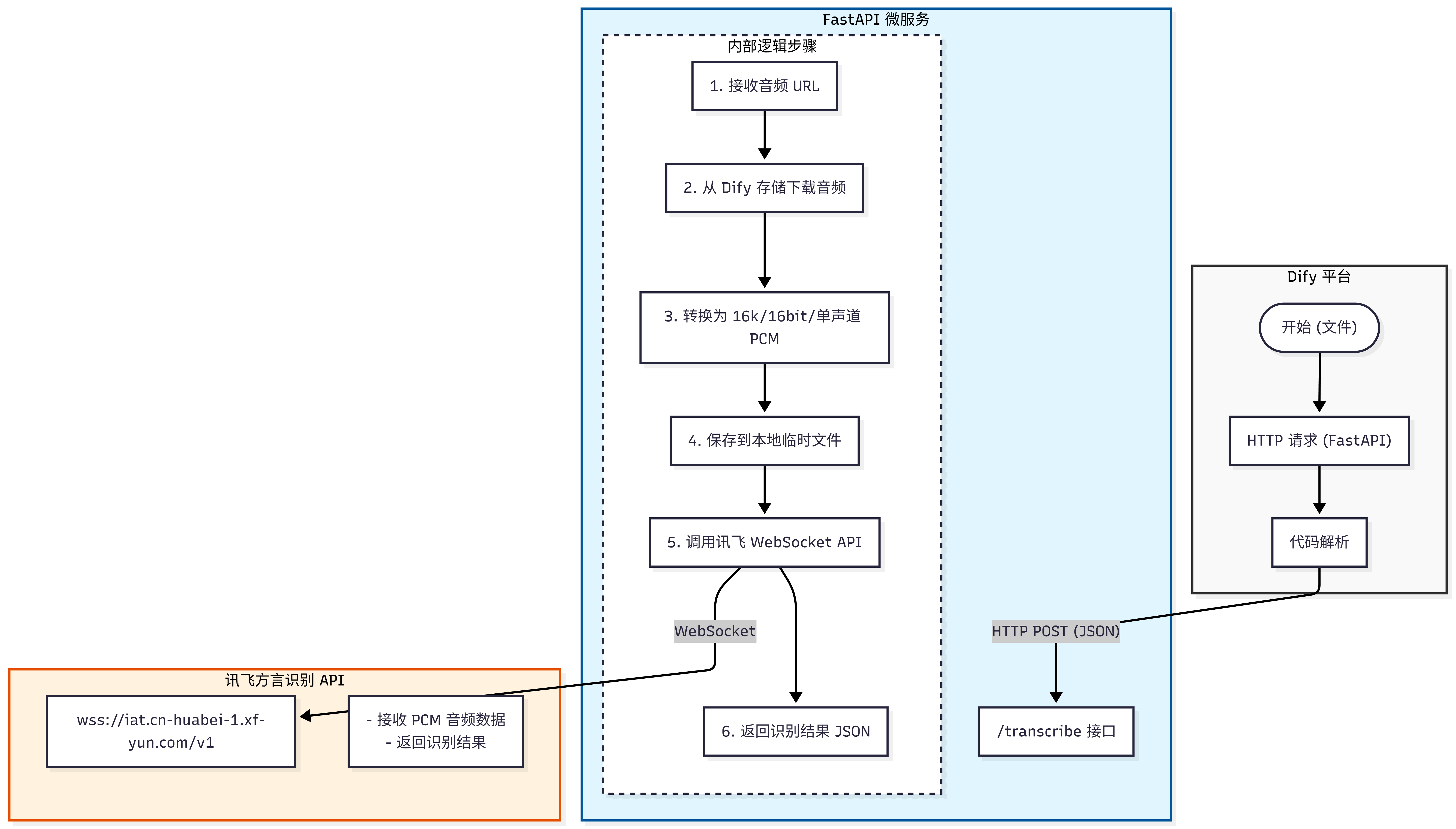 在构建 AI 语音应用时,开发者常面临一个尴尬的"最后一公里"问题:大模型(LLM)虽能理解万物,却听不懂方言。 尤其是在应急汇报、乡镇政务或医疗问诊等特定场景中,标准普通话往往让位给情感更真切、但也更难识别的方言口音。如何利用 Dify 的强大编排能力,结合 讯飞(iFLYTEK) 深耕多年的方言识别引擎,构建一套高效、稳健的方言转写服务?
