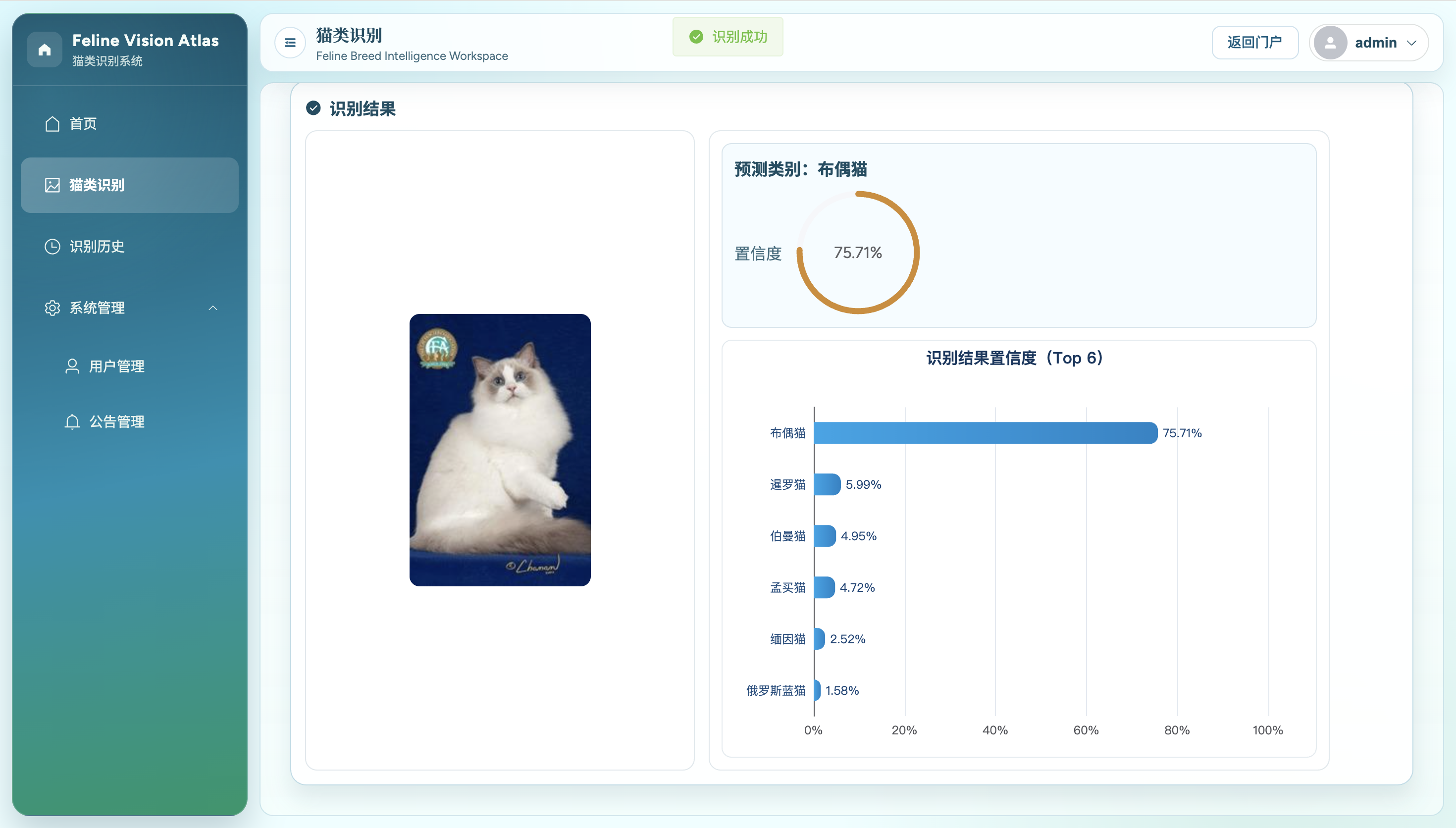 基于深度学习的猫类识别系统,识别类别包括伯曼猫、俄罗斯蓝猫、埃及猫、孟买猫、孟加拉猫、布偶猫、斯芬克斯猫、暹罗猫、波斯猫、缅因猫、英国短毛猫和阿比西尼亚猫共 12 类。系统以前后端分离方式实现,前端采用 Vue3 与 Element Plus 构建交互界面,后端基于 Flask 框架提供用户认证、图像上传、品种识别、历史记录管理和公告管理等接口服务,算法部分使用 TensorFlow 搭建并加载 ResNet50 模型完成图像分类任务。用户登录后可上传猫咪图片,系统会返回预测类别、识别置信度及各类别概率排序结果,并自动保存识别历史,方便后续查看与管理。