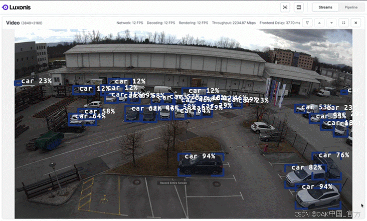 在此设置中, Pipeline以 真正的 4K 分辨率, 12 FPS 进行工作 . 在我们的实验中, 这个例子 最大化提升了 USB 吞吐量 , 达到了约2.22--2.30 Gbps . 确切的吞吐量取决于所使用的USB 口和主机系统 , 峰值测量值在某些测试中高达2 .6 Gbp s .
