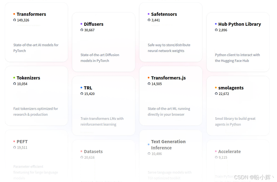 Hub和Hub library:作为访问所有AI模型、数据集和演示空间 (Spaces) 的核心门户,这是Hugging Face最广受欢迎的功能之一。开发者可便捷获取前沿AI模型与数据集,既支持模型二次开发,也支持直接推理应用。Hub库提供了通过Python代码访问该Hub的编程接口Datasets(数据集库):除了PyTorch内置的数据集库,Hugging Face的Datasets库使PyTorch能够轻松使用Hugging Face的数据集,甚至是非Hugging Face的第三方数据集Accelerate(加速库):这个工程导向的工具库能有效利用多GPU/TPU配置来训练和推理大型AI模型,并支持混合精度等优化技术Optimum(优化库):另一个工程优化库,专注于部署阶段的模型优化,可在指定目标硬件上实现峰值性能。它能确保最优的效率、速度与资源利用率,显著降低运营成本并提升用户体验