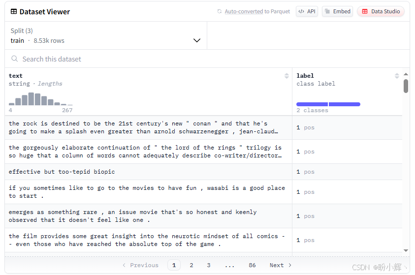在显示的热门数据集中,我们选定 rotten_tomatoes 数据集。该数据集包含带有情感标签(正面评价标为 1,负面标为 0)的电影评论,其数据结构如下图所示: