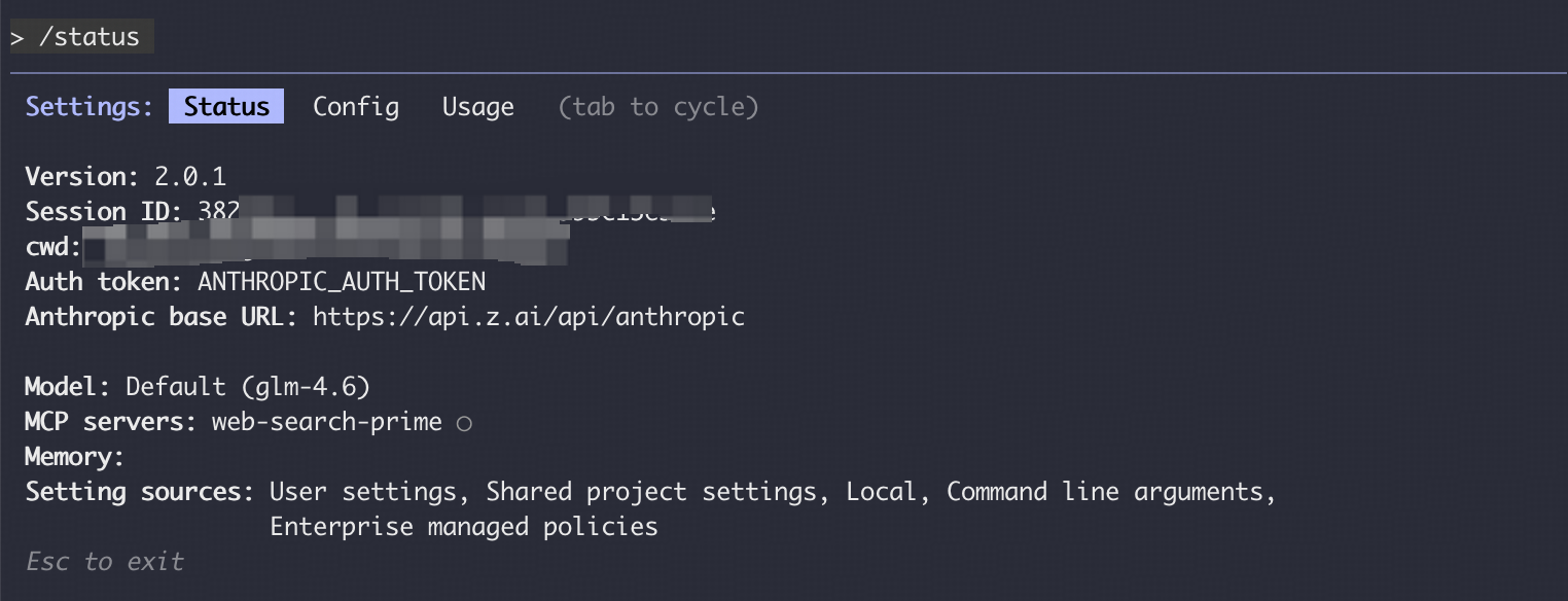 claude启动 Claude Code,输入/status查看当前模型状态。