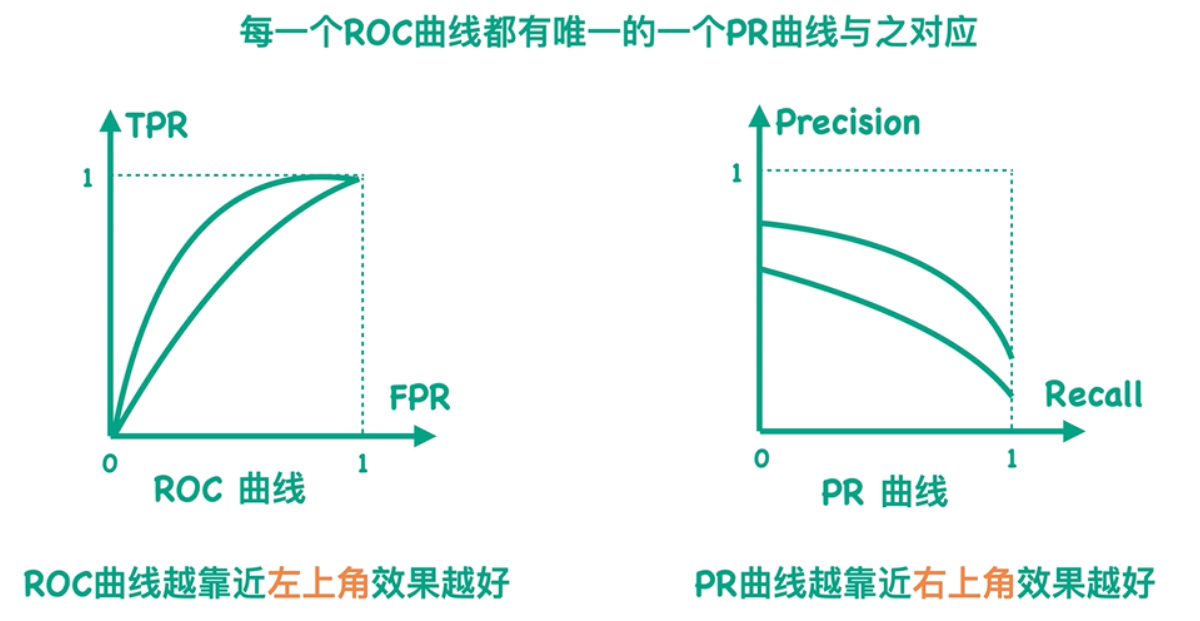 如果我们将纵坐标换成Precision精确率的值,横坐标换成Recall召回率的值,将所有点连接成曲线就成了PR曲线,**ROC曲线是越靠近左上角表示分类器效果越好,PR曲线越靠近右上角表示分类器效果越好**。