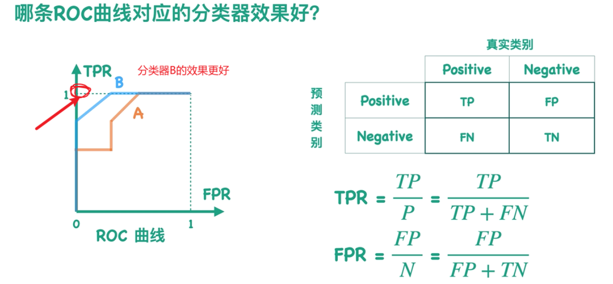 因为在真实类别中,TP+FN的和恒不变,FP+TN的和恒不变,所以不论是TPR值还是FPR值的分母都恒不变,所以我们只需要看分子,在TPR中分子是TP(表示真正对的里面猜成"is"的数量)、而FPR中的分子是FP(表示真正错的里面猜成"is"的数量),所以**TPR越大且FPR越小表示分类器效果越好**,即**ROC曲线越靠近左上角越好**。