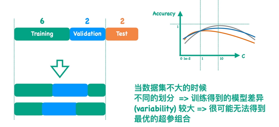 正常情况下如上图,当超参数C取1时,验证集的Acc最大,此时是最好的情况,我们会选这组最优的参数来跑测试集。但是当数据集不大的时候往往会出现下图问题: