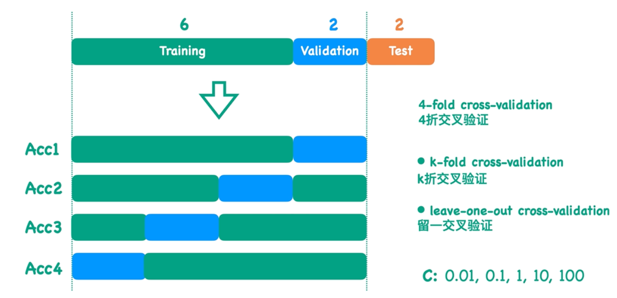 为了解决以上问题,我们提出了一种**K-Fold交叉验证**的方法,就是将Test测试集以外的数据随机且均匀地分成k份,分别将每一份作为Validation验证集来求Acc,最后取每一份Acc和的平均值。如下图,将Test测试集以外的数据随机且均匀地分成4份,就叫**4-Fold交叉验证**。K-Fold交叉验证有个极端情况,那就是将K取最大值(样本总数),此时Training:Validation = K-1 :1,即每次从训练数据中抽取一条数据作为验证集,这就叫**留一交叉验证**。