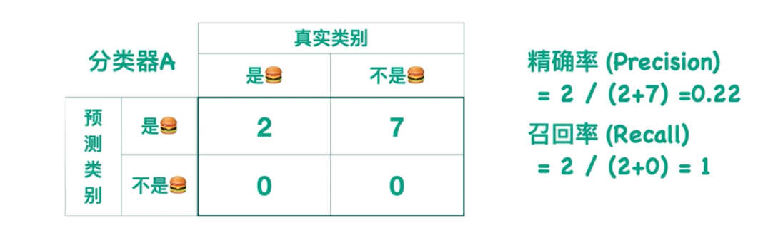 对于一个二分类问题来说,分类器所得到的结果是一个2X2的矩阵,比如下面这张判断是否是汉堡的机器学习例子: