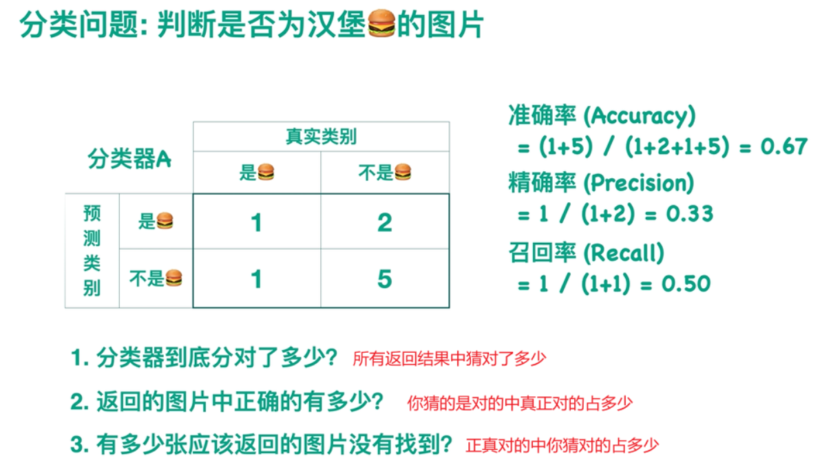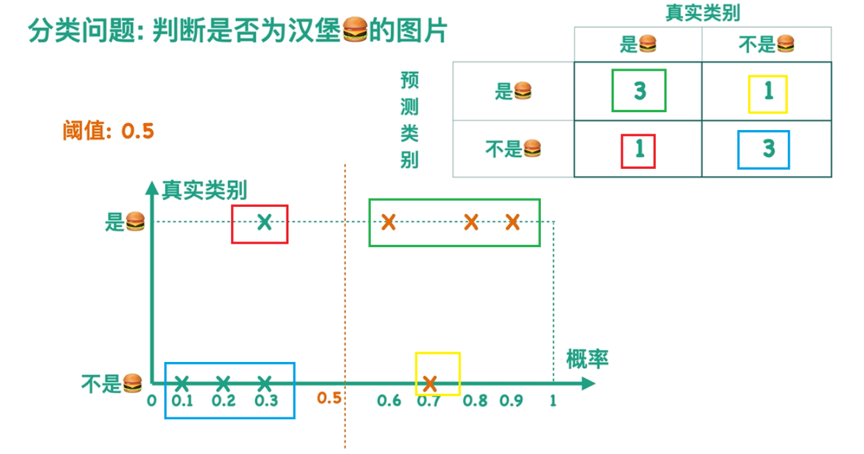 对于一个二分类问题,如何判断图片是否为汉堡,现在我需要给分类器一个阈值0.5,概率>0.5即判断为汉堡;反之判断为不是汉堡。