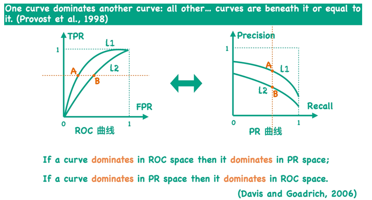 在一篇论文中表示,如果在ROC空间中L1曲线 **dominates** L2曲线,那么在PR空间中L1曲线也一定 **dominates** L2曲线 ,说人话就是:**如果在ROC空间中L1曲线所有点都位于L2曲线的上方,那么在PR空间中L1曲线的所有点也一定位于L2曲线的上方**,反之亦成立。
