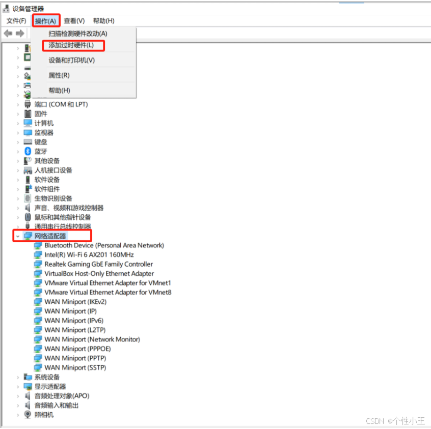 1.2 单击选中网络适配器-点击操作-选择添加过时硬件