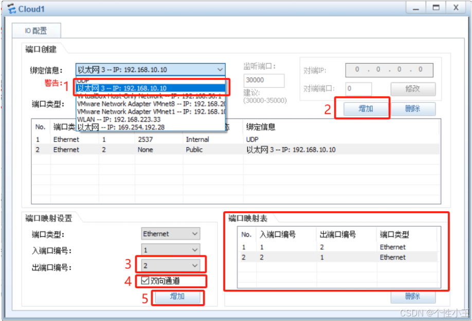 3.4 选择以太网3(这个就是你前面配置的环回网卡)-点击增加-出口编号选择2-勾选双向通道-点击增加(可以看到端口映射表多了一个端口)