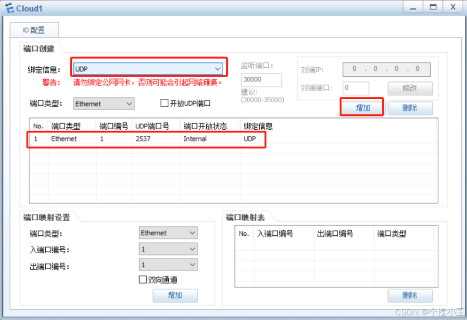 3.3 选择UDP-点击增加(可以看到多了一条绑定信息)