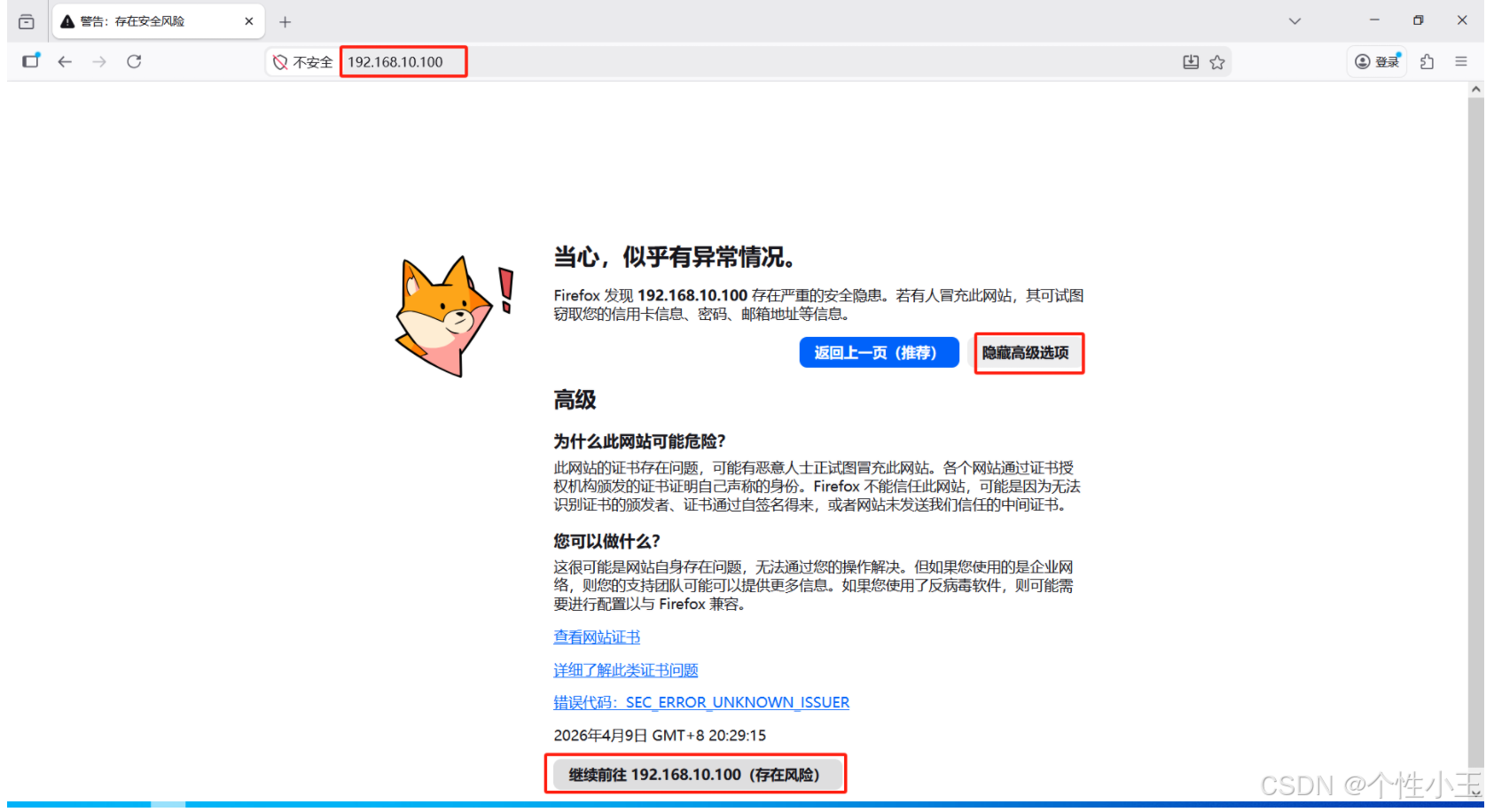 4.2 在浏览器输入你vlan10配置的IP地址-点击高级选项-继续前往
