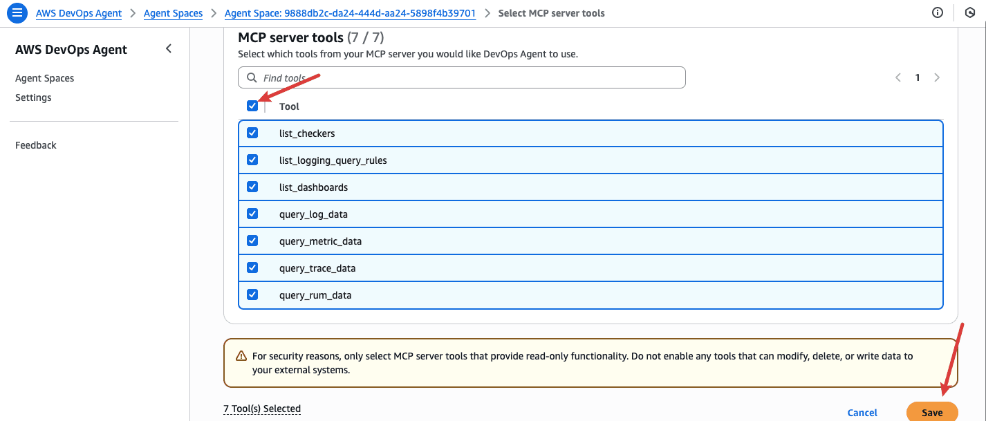 1、进入目标 Agent Space 的 MCP server tools 配置页面,页面将展示可选择的 MCP 工具列表,本次接入需将所有 MCP Tool 工具全部添加,包含list_checkers、list_logging_query_rules、list_dashboards、query_log_data、query_metric_data、query_trace_data、query_rum_data共 7 项;