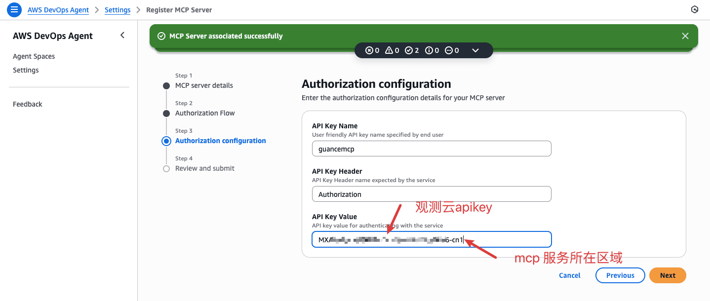 完成以上配置后,依次点击 "Previous" 核对信息,确认无误后点击 "Next" 提交,页面提示 "AWS DevOps Agent MCP Server associated successfully" 即代表 MCP 服务器基础配置完成。