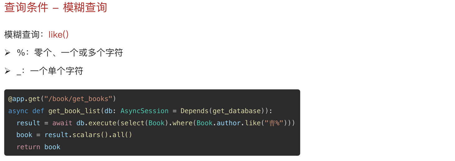 # result = await db.execute(select(Book).where(Book.author.like("曹%")))