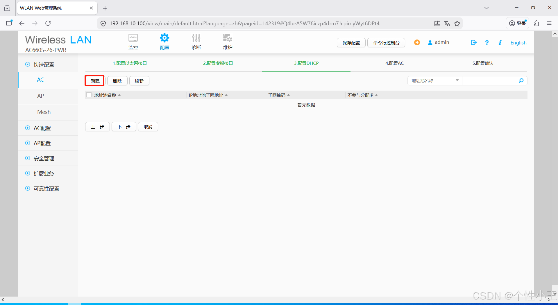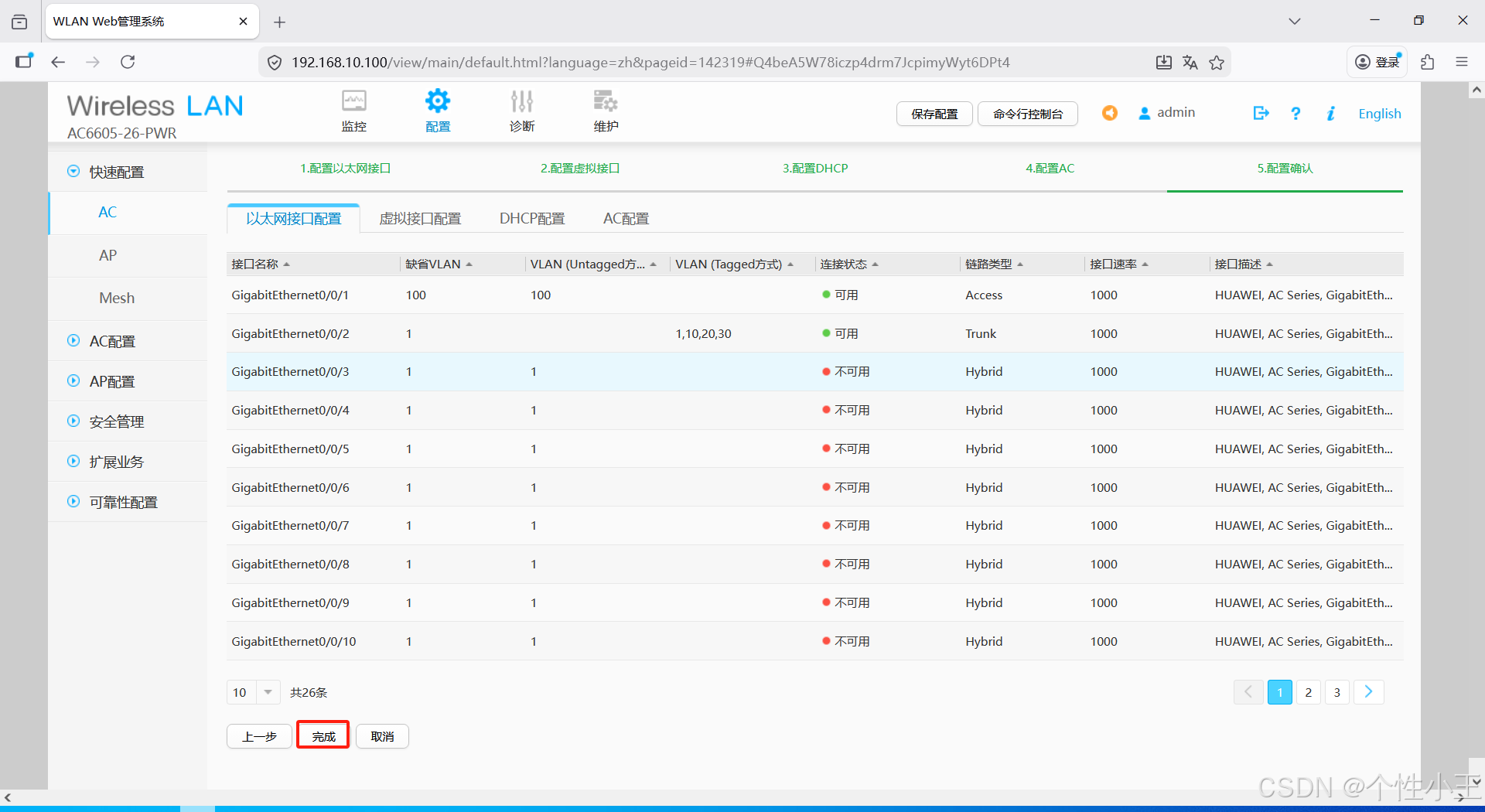 - 点击配置-快速配置-AC-选择AC连接接入交换机的接口