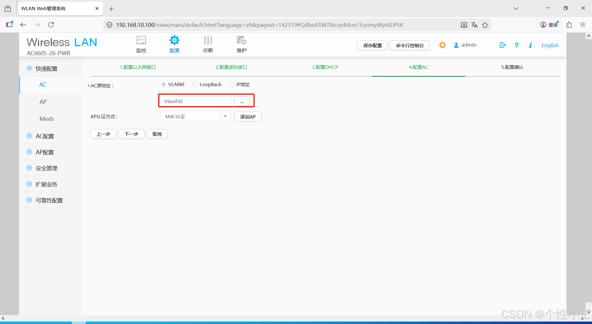 - 配置过程需要配置AC的源地址,这里我们的源地址就是管理vlan,所以我们选择vlan30即可