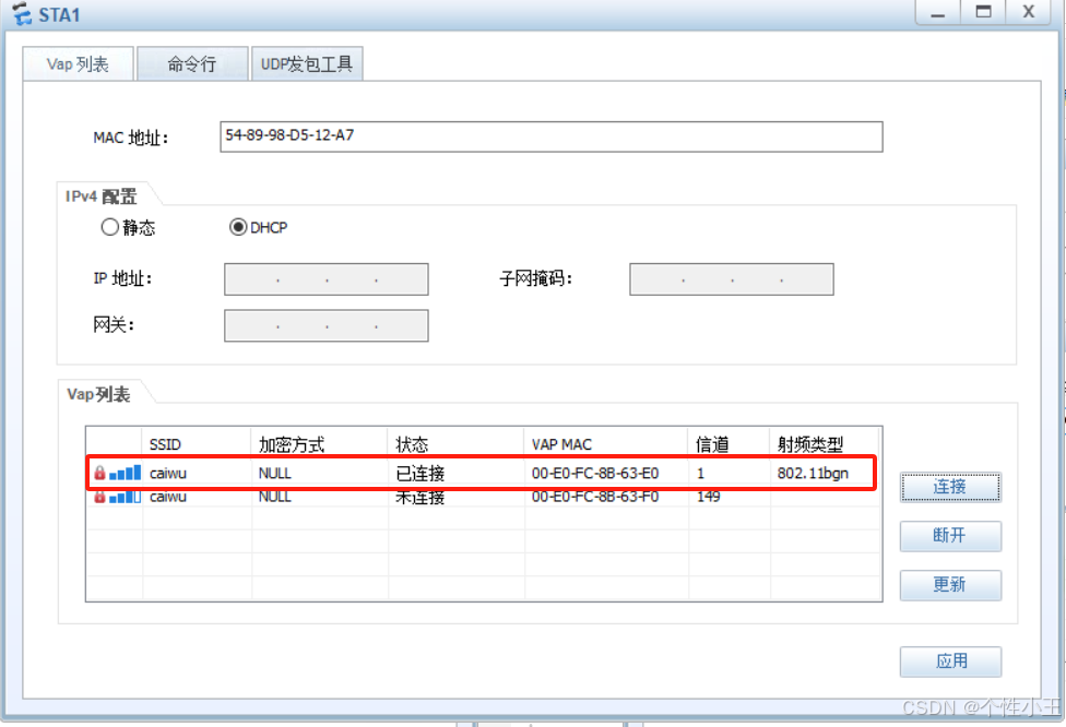 - 在终端输入ipconfig可以看到IP地址,恭喜你你成功的完成了所有配置,并且让终端设备成功通过无线的方式获取到IP地址!!!