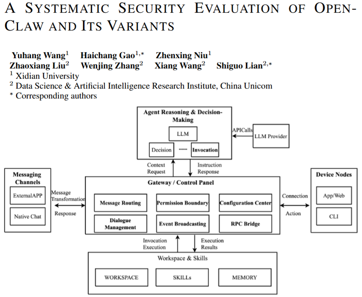 该论文名为《A SYSTEMATIC SECURITY EVALUATION OF OPENCLAW AND ITS VARIANTS》 。作者团队包括来自西安电子科技大学的Yuhang Wang、Haichang Gao等人,以及中国联通数据科学与人工智能研究院的Xiang Wang和Shiguo Lian等研究人员 。该论文于2026年4月发表在arXiv预印本平台上 。