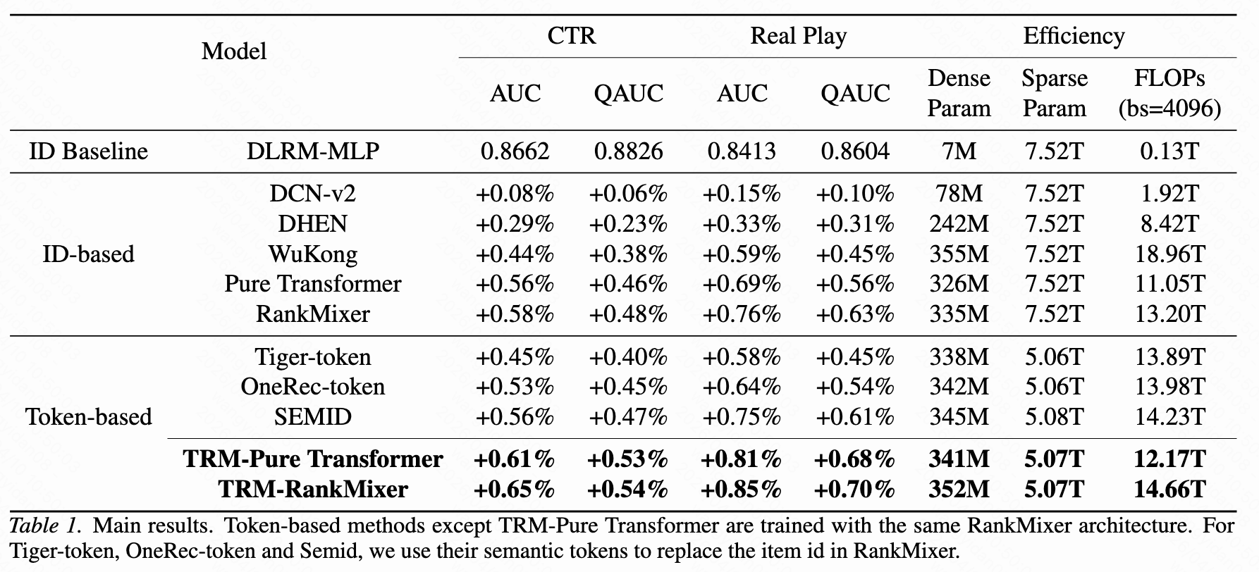 在真实搜索引擎(TIKTOK视频搜索)上线了 TRM 模型进行在线实验,对比基线的 大小为7M的DLRM 模型,使用更大的 TRM-Rankmixer-352M 模型,CTR 对应的 QAUC 提升 0.54%。
