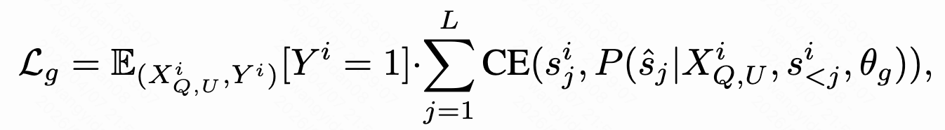 - 对于生成目标,使用 Xq 和 XU 作为输入来自回归生成target item的语义id,采用NTP损失来优化生成目标: