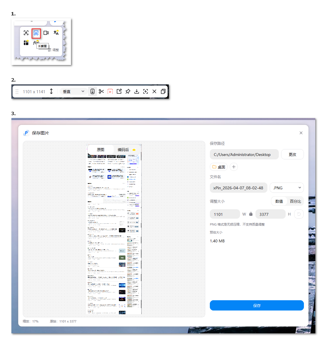 完成后,长图会自动出现在编辑器中,你可以进行标注、裁剪,然后保存或复制到剪贴板。