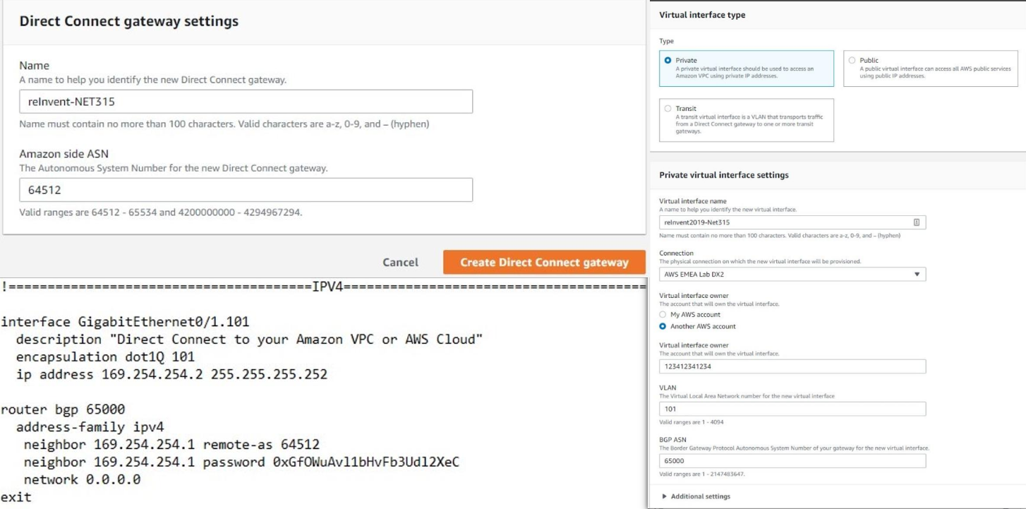 在这个场景中,我们通常会使用私有虚拟接口。如上图所示,您在本地创建一个私有VIF,将其关联到之前创建的Direct Connect Gateway。这个VIF需要指定一个VLAN ID和您的本地BGP ASN。这个私有VIF就像是本地网络通往Direct Connect Gateway的一个入口。