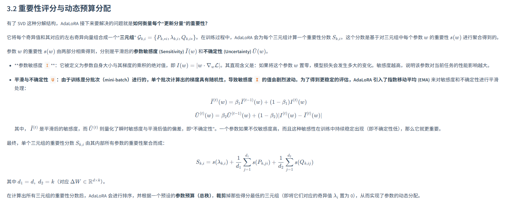 重要性评分,对于每个W计算其敏感度,以及分批次的敏感度稳定性,结合二者得到W重要性分数,将其svd特征值设为0,计算敏感度的反向传播参数总是需要计算的,对模型的速度影响很小。