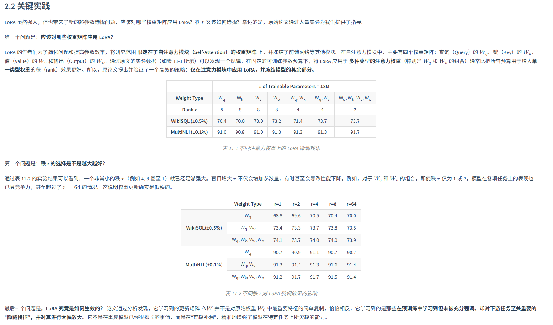 图 11-1 的右侧展示了 Adapter 模块自身的结构,主要包括一个"降维"的全连接层(Feedforward down-project)将高维特征映射到低维空间,一个非线性激活函数(Nonlinearity),一个"升维"的全连接层(Feedforward up-project)再将特征映射回原始维度,以及一个贯穿该模块的残差连接将模块的输出与原始输入相加,保证信息流的稳定。通过这种"瓶颈式"的结构,Adapter 模块可以用极少的参数量来模拟特定任务的知识。缺点是依旧吃很大资源。