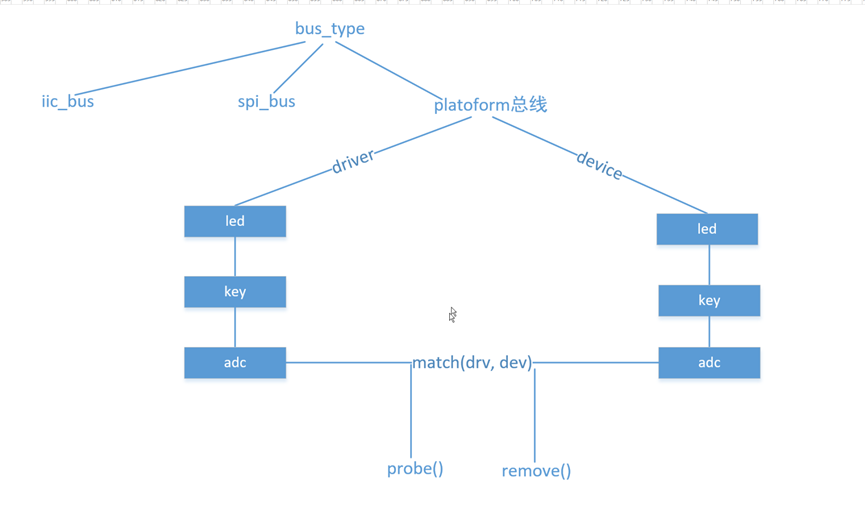 probe是 Platform 驱动中真正"把硬件管起来"的函数:当内核找到与驱动匹配的硬件设备时,它负责初始化该设备并让它对操作系统可用。相当于匹配driver和device的(3)static struct platform_driver drv 填充虚拟总线platform_driver 结构体