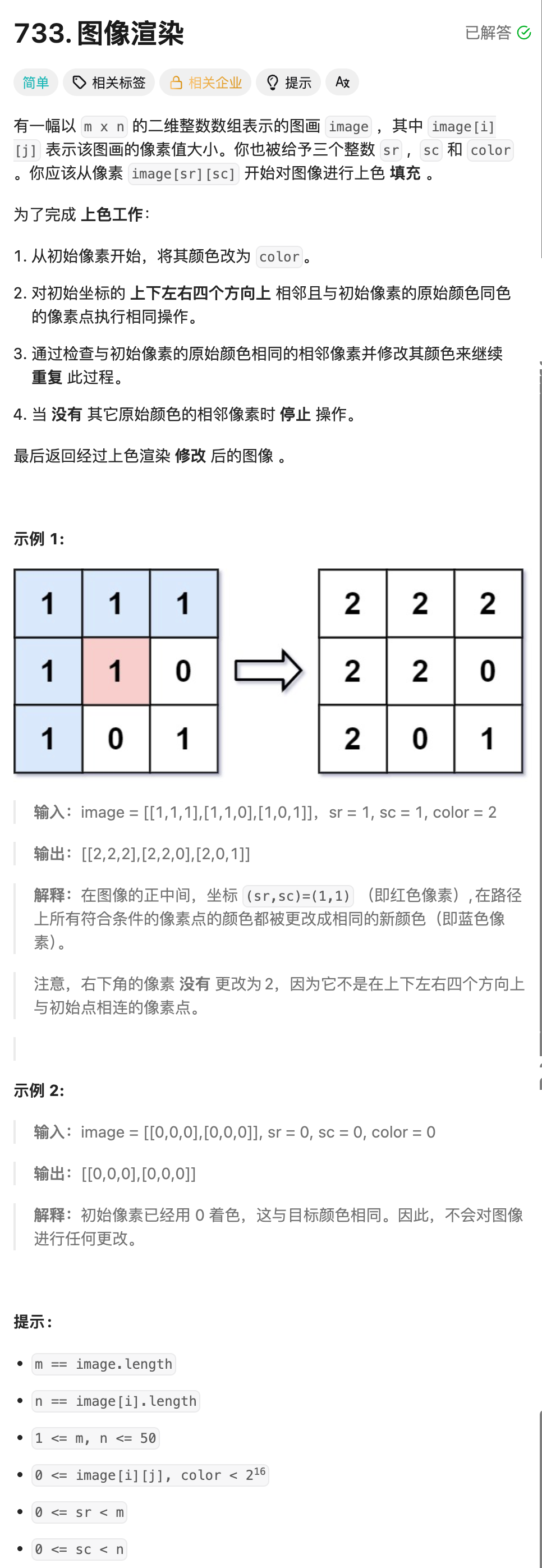 以起始坐标为种子 ,用 BFS 逐层向外扩散 ,把所有和起始点连通、同色的格子,全部染成目标颜色. - BFS 优势