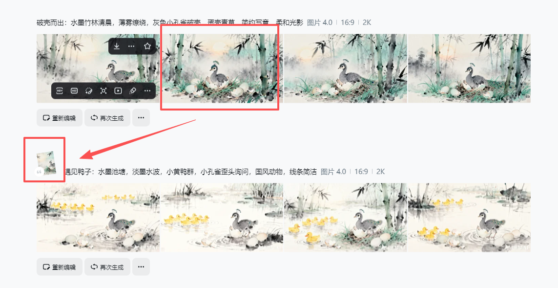 选择每一套里面的偏平面的风格图片,但是第四张都很立体,再用两张参考图生成平面风格