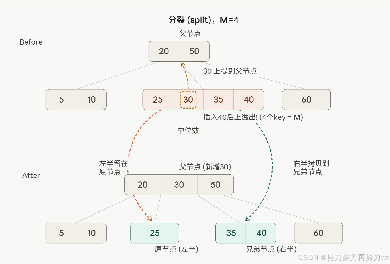 👉 只能在叶子节点插入,因为叶子节点不涉及子树划分,不会破坏已有结构的语义一致性。