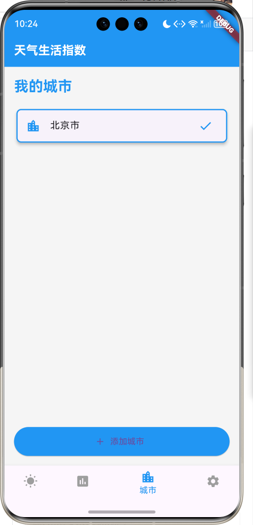 应用以清新的蓝色为主色调,象征天空与清新。涵盖天气预报、生活指数、城市管理、设置中心四大模块。用户可以查看实时天气、获取生活建议、管理关注城市、设置提醒功能。