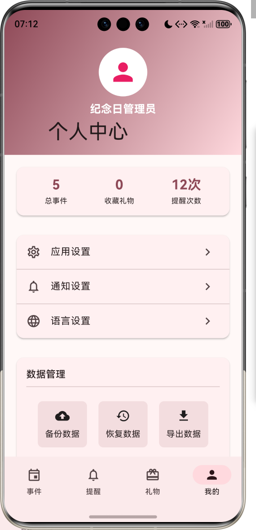 生日纪念日提醒是一款贴心的生活管理应用,帮助用户记录和管理家人朋友的生日、重要纪念日等特殊日期,并提供提前提醒功能。应用不仅能在重要日子来临前发送提醒,还能根据关系、兴趣等因素推荐合适的礼物 ideas,让用户再也不会忘记重要日子。应用以温馨的粉色为主色调,象征关爱与温暖,涵盖日期管理、提醒设置、礼物推荐、个人中心四大模块。