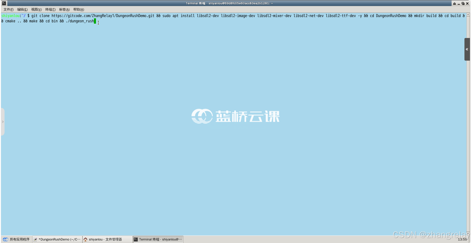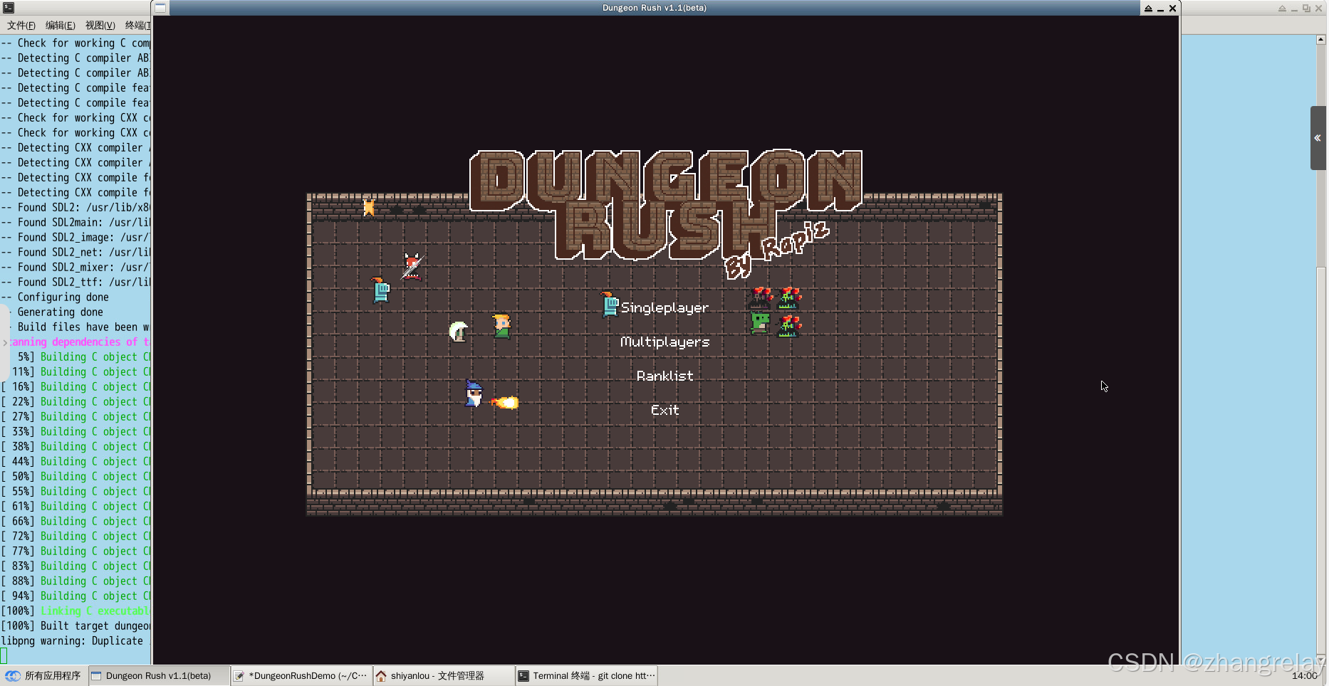 git clone https://gitcode.com/ZhangRelay1/DungeonRushDemo.git && sudo apt install libsdl2-dev libsdl2-image-dev libsdl2-mixer-dev libsdl2-net-dev libsdl2-ttf-dev -y && cd DungeonRushDemo && mkdir build && cd build && cmake .. && make && cd bin && ./dungeon_rush