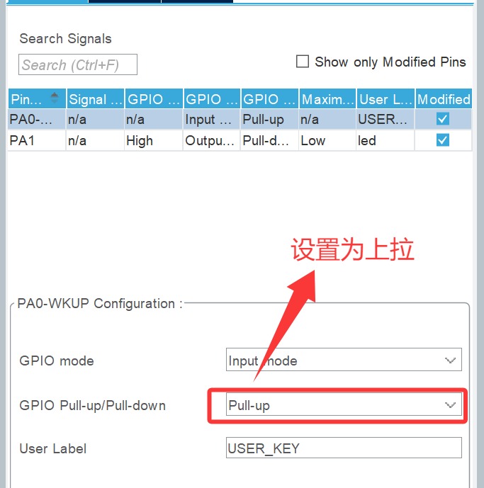 所以按照这个代码逻辑 PA0配置只能为上拉输入,不按按键默认高电平