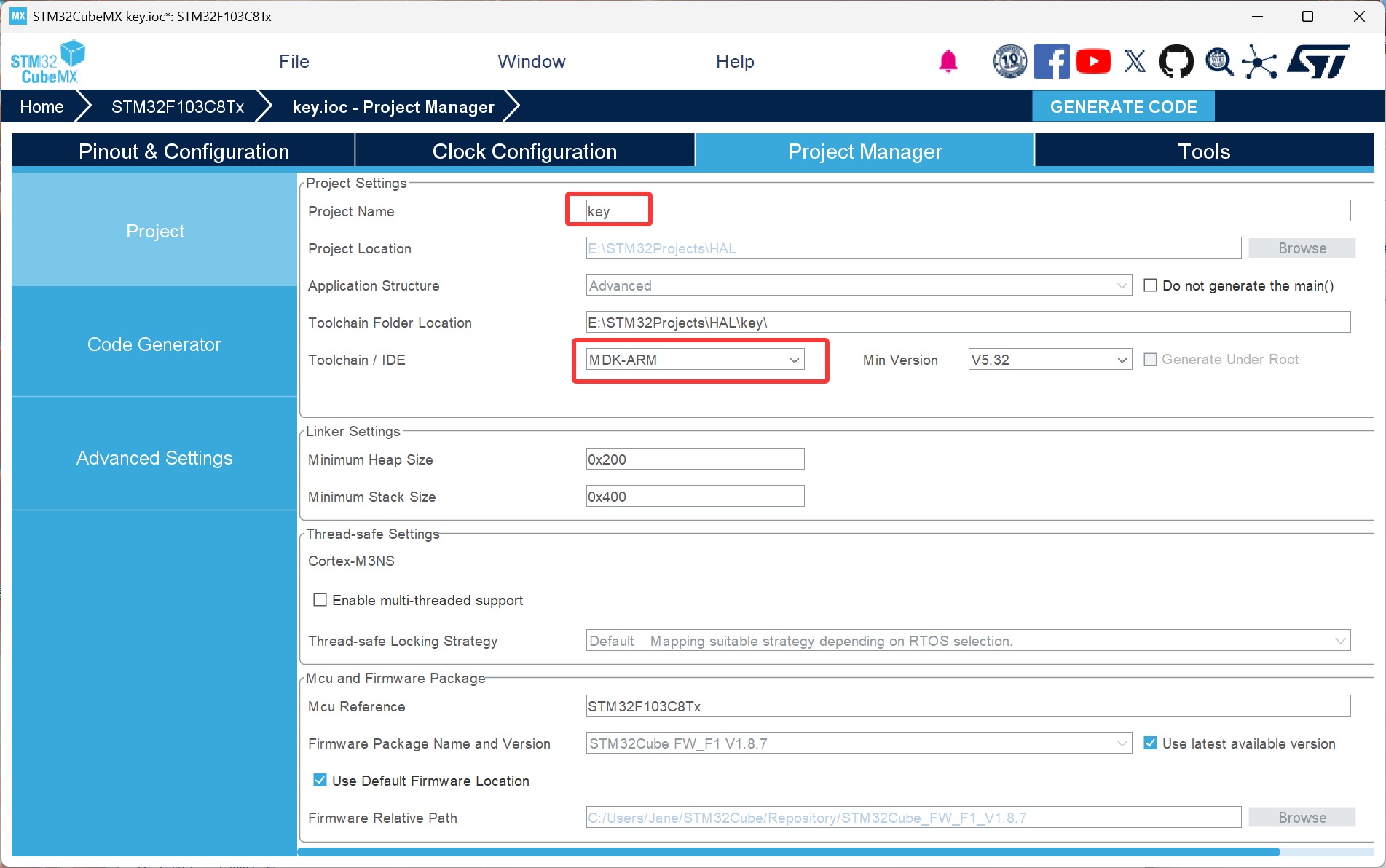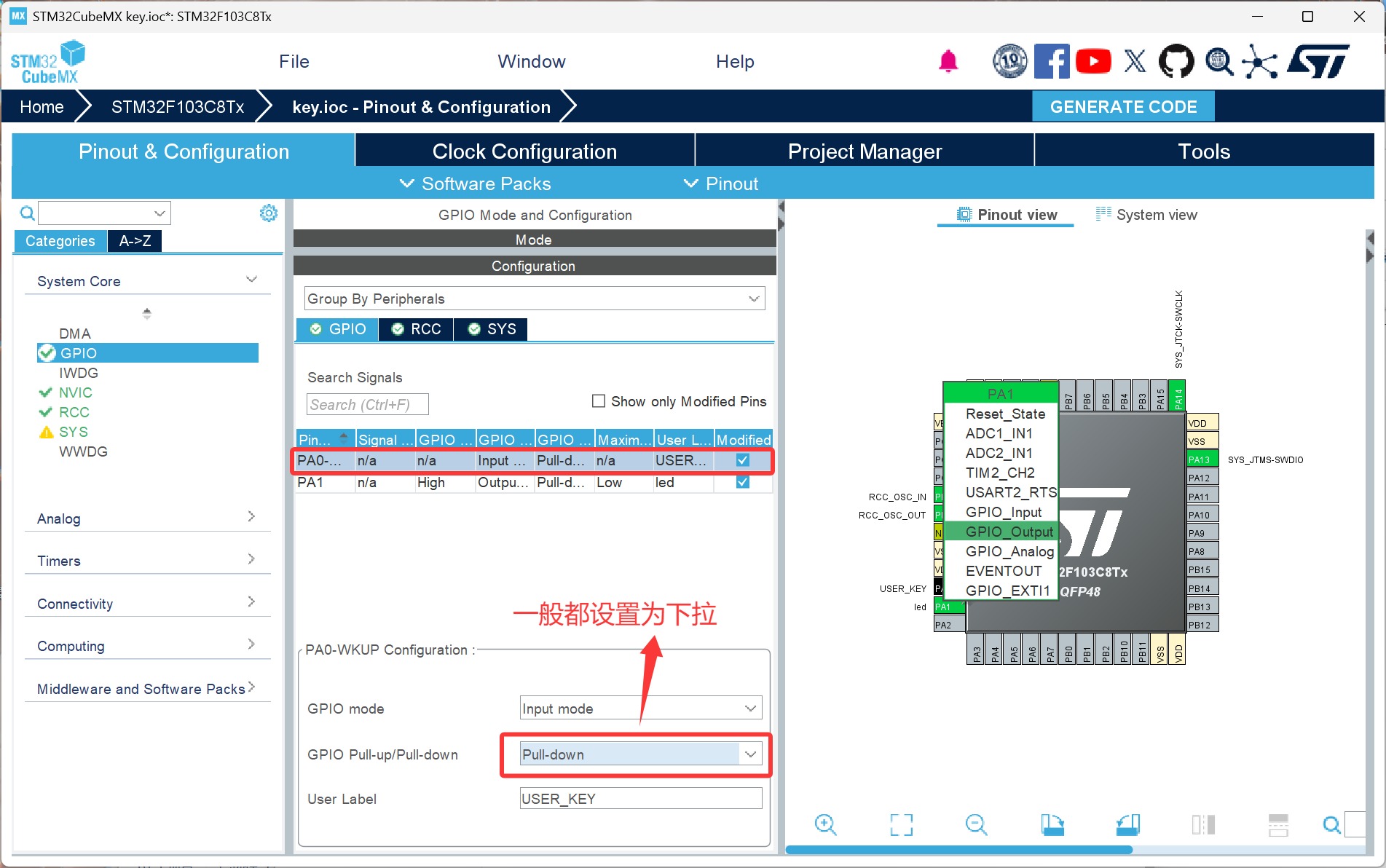 使用STM32CubeMX软件配置STM32F103C8T6开发板的按键作为输入,实现按键控制 LED 翻转,掌握GPIO输入部分
