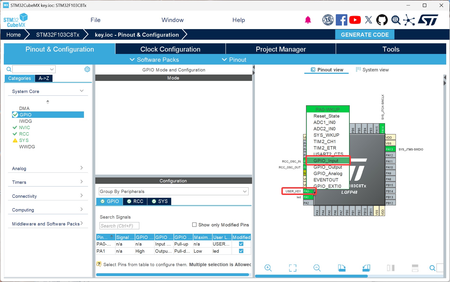 在Pinout & Configuration页面右边单片机引脚预览Pinout view中,寻找需要设置的具体GPIO,这里我们选择PA0引脚,左键单击引脚将引脚功能设置为GPIO_Input
