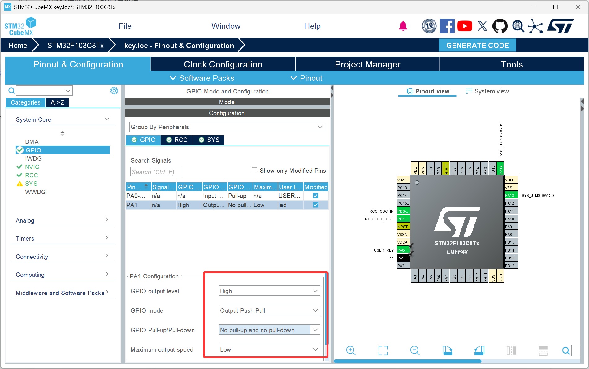 选择PA1引脚,左键单击引脚将引脚功能设置为GPIO_Output,用来控制led亮灭