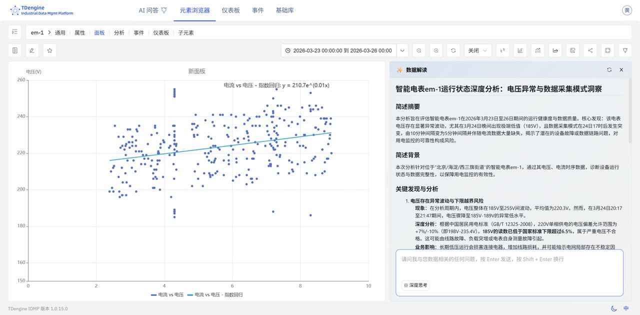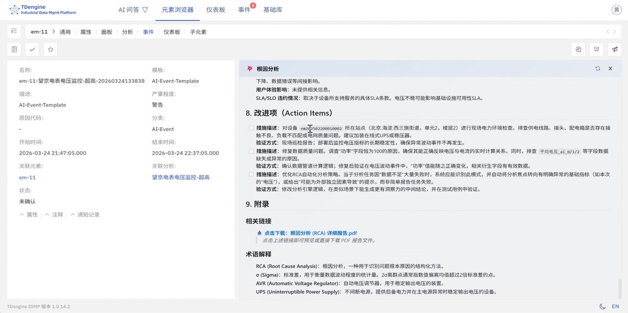 在本次版本更新中,TDengine IDMP 的 AI 能力有了更明显的增强。AI 面板智能解读与事件根因分析能力大幅升级,支持对话式交互,且解读页面支持二次追问;根因分析范围也从具体设备、元素扩展到了中间节点元素。